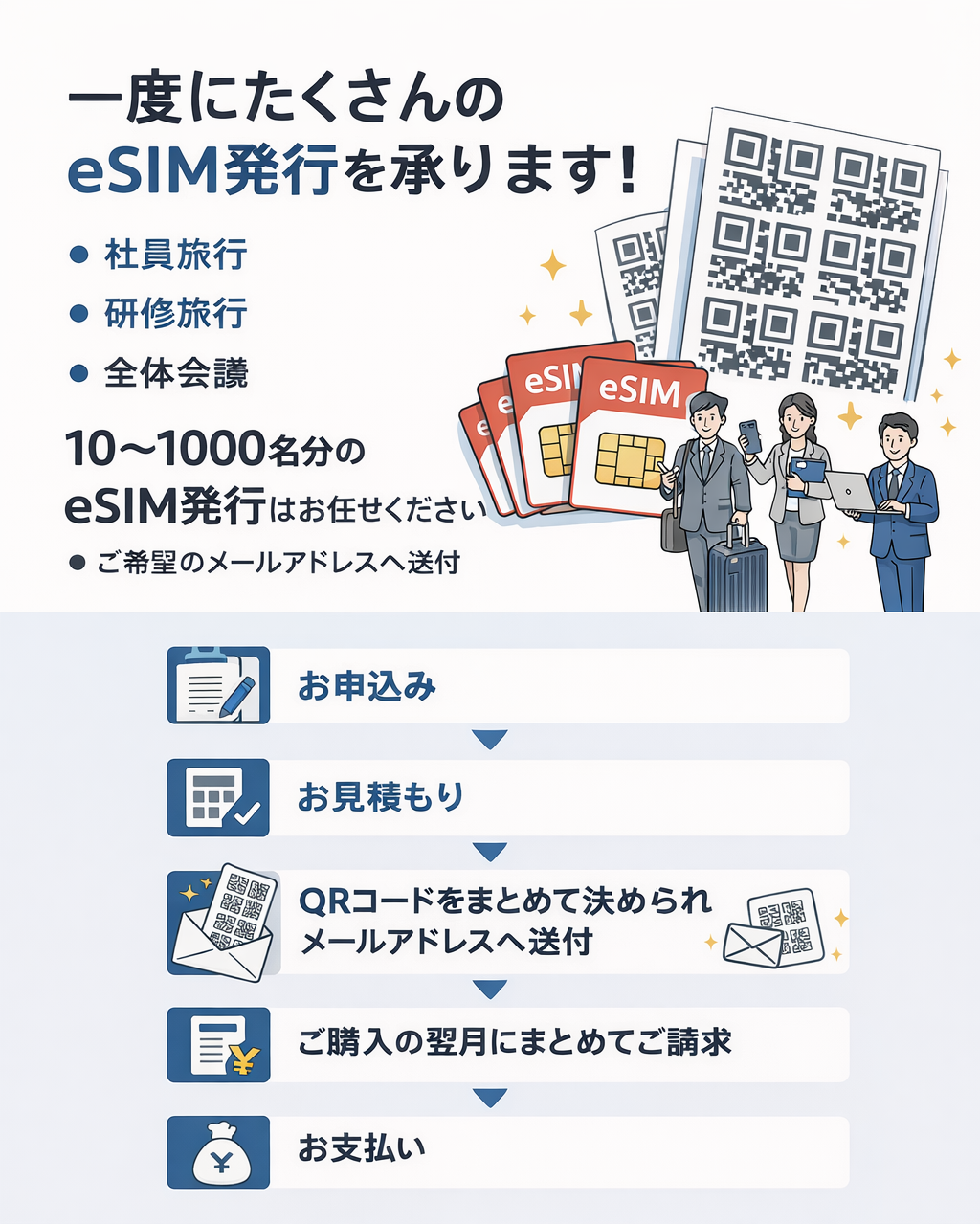 毎回のSIM購入・設定の手間を削減し、出張前日の負担をゼロにします。 -